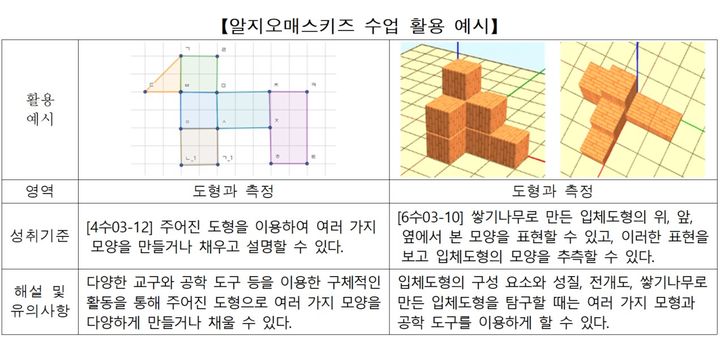 이처럼 '알지오도구' 기능을 통해 점·선·도형·이동·측정 등 평면(2D) 도형 및 쌓기나무·연결큐브·입체도형·전개도 등 3차원(3D) 도형을 그려보고 관찰할 수 있다.