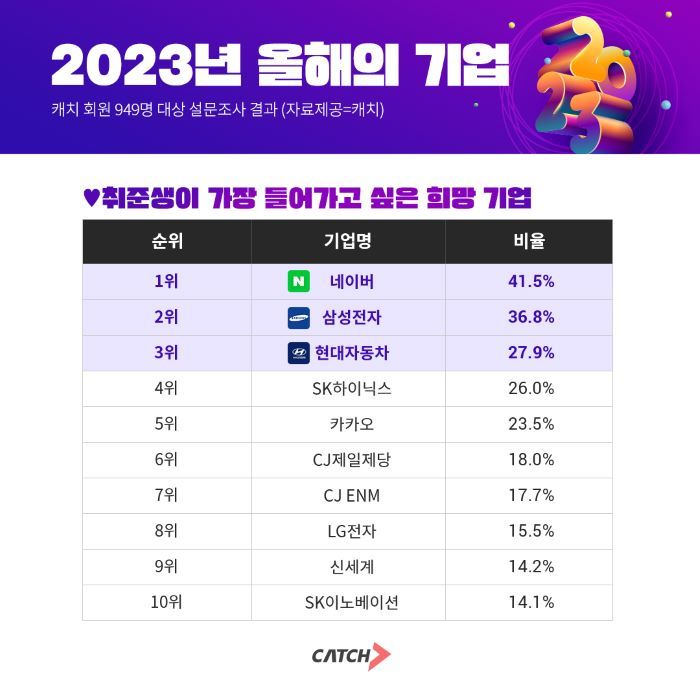 채용 플랫폼 캐치는 29일 올해의 기업 순위를 공개했다. 이 순위는 그해 취업준비생에게 가장 많은 사랑을 받은 50개 기업을 대상으로 투표를 통해 선정한다. 올해는 투표에 949명이 참여했다.