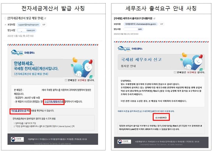 [세종=뉴시스]용윤신 기자 = 국세청은 국세청을 사칭하는 의심스러운 이메일·문자메시지 수신 시 아래 사항에 유의해 피해가 없도록 주의해달라고 10일 밝혔다.