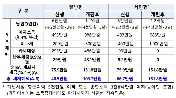 개편 이후에는 같은 기간 최대 1억2000만원까지 납입할 수 있고 이로 인해 예상되는 이자소득은 986만원 수준이다. 비과세 금액(500만원)을 제외한 뒤 납부해야 할 세금은 48만1000원으로 비(非) ISA 계좌에서 나가는 세금 151만8000원보다 103만7000원 절감 효과가 생긴다.
