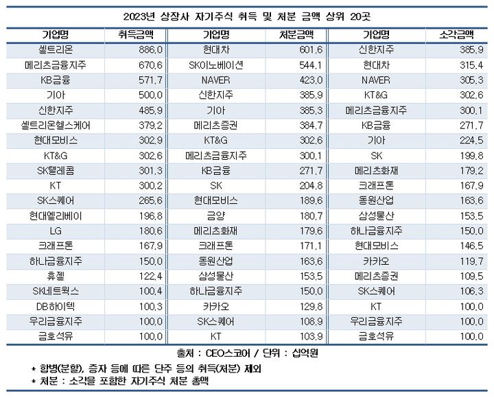 자사주 취득이 가장 많은 기업은 9000억원 가량을 산 셀트리온이었고, 자사주 소각이 가장 많은 기업은 약 3800억원을 소각한 신한지주였다. 일반 기업 가운데는 현대차가 자사주 3100억원을 소각해 가장 많았다.