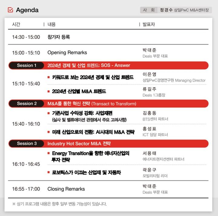 이번 세미나는 세 가지 세션으로 구성된다. 1부에서는 이은영 삼일PwC 경영연구원 상무가 '키워드로 보는 2024년 경제 및 산업 트렌드'를 주제로, 류길주 딜 1그룹장이 '산업별 M&A 트렌드'를 주제로 강연할 예정이다.