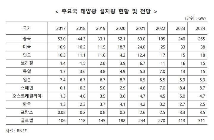 이는 전세계적으로 확대 추세인 것과 대조적이다. 지난해 상반기 글로벌 태양광 투자액은 2390억 달러(약 318조5870억원)로 사상 최고치를 기록했다. 이에 따라 올해 글로벌 태양광 시장은 510GW가 설치되면서, 사상 처음으로 500GW시대가 열릴 전망이다. 특히 미국과 중국 두 국가의 설치량이 400GW를 넘어선 것으로 조사됐다.
