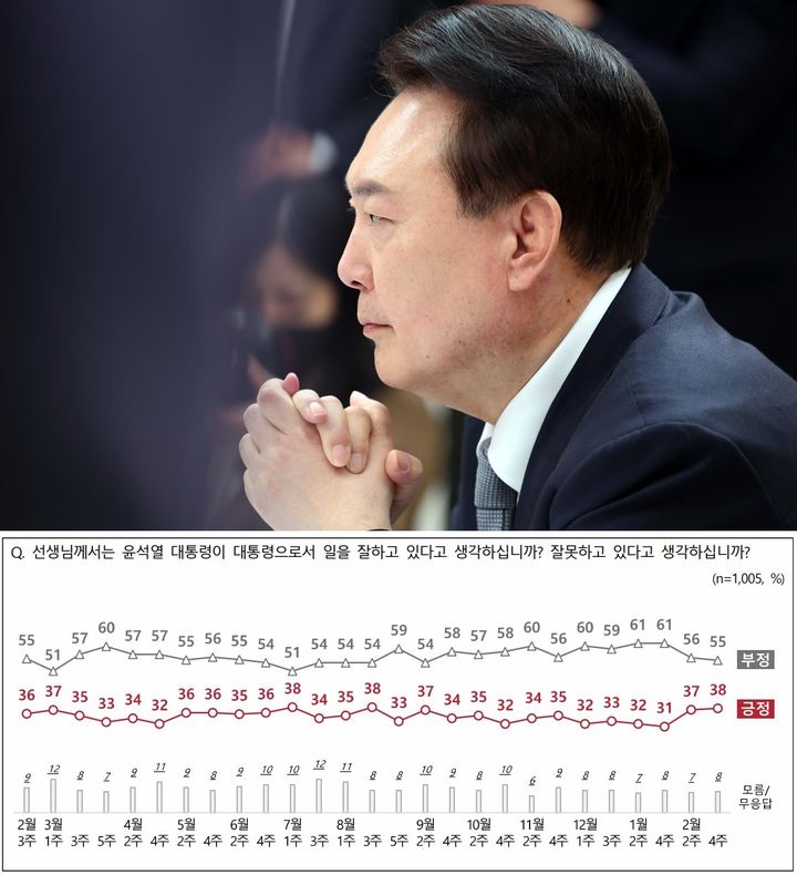 엠브레인퍼블릭·케이스탯리서치·코리아리서치·한국리서치가 지난 19∼21일 전국 만 18세 이상 남녀 1005명을 대상으로 진행한 전국지표조사(NBS) 결과 윤 대통령의 직무수행에 대한 긍정 평가는 지난 조사(2월 둘째 주) 대비 1%포인트 오른 38%로 나타났다.