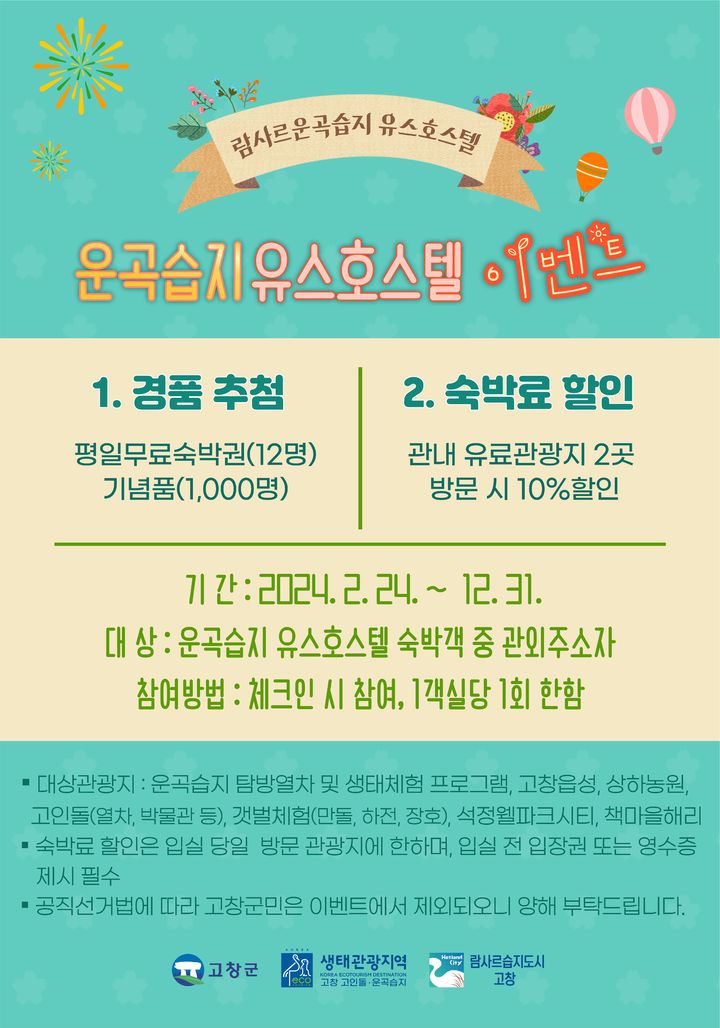 경품추첨 이벤트는 람사르운곡습지 유스호스텔 숙박객 중 관외 주소자를 대상으로 1객실당 1회씩 뽑기를 통해 경품을 제공하는 행사다. 경품 참여자에게는 평일 무료숙박권(12명) 및 기념품(1000명)이 선물로 제공된다.