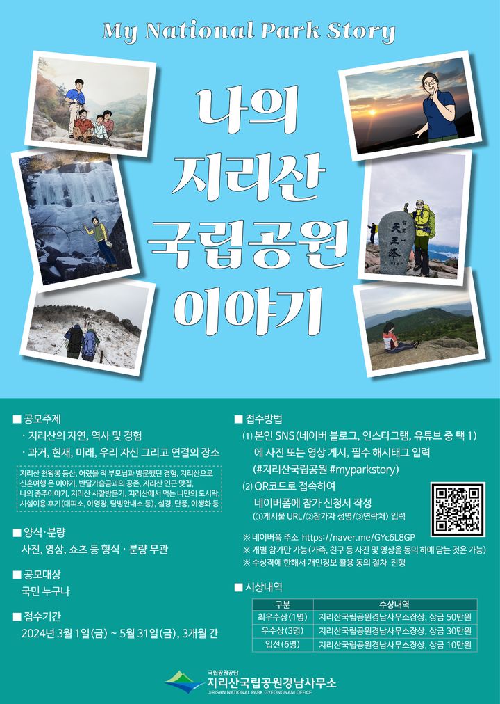양식과 분량은 자유이며 네이버 블로그, 인스타그램 및 유튜브 중 하나의 채널을 활용해 자신의 이야기를 게시하고 홍보문의 QR코드(또는 웹주소)에 접속해 참가 신청서를 제출하면 된다. 우수 이야기에 대해서는 지리산국립공원경남사무소장 상장과 더불어 최대 50만원의 상금도 수여된다.