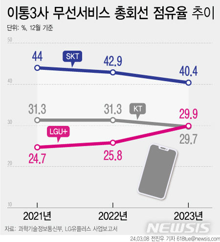 SK텔레콤의 무선서비스 총회선 점유율은 2021년 말 44%이었는데, 지난해 말 40.4%로 2년 만에 3.6%p가 감소했다.