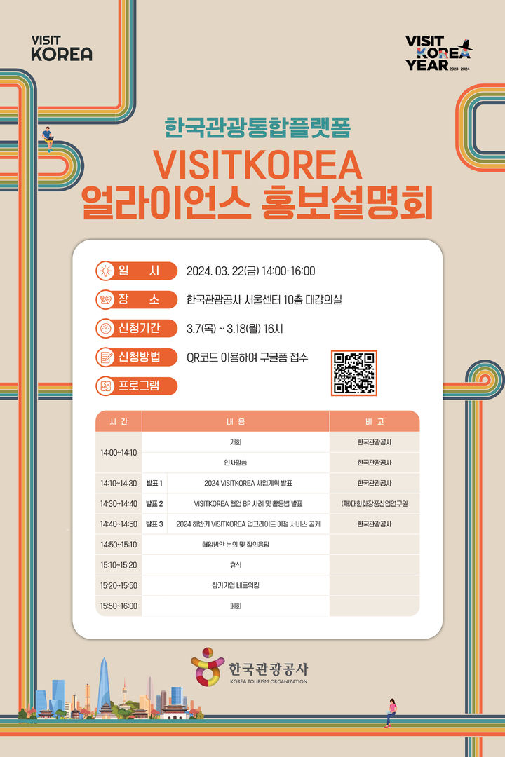 관광공사는 오는 22일에는 공사 서울센터에서 2024 VK 얼라이언스 홍보설명회를 개최한다. VK 얼라이언스 운영 제도를 포함해 전년도 협업 기관 성공 사례발표, 현장 네트워킹 세션 등이 진행된다.