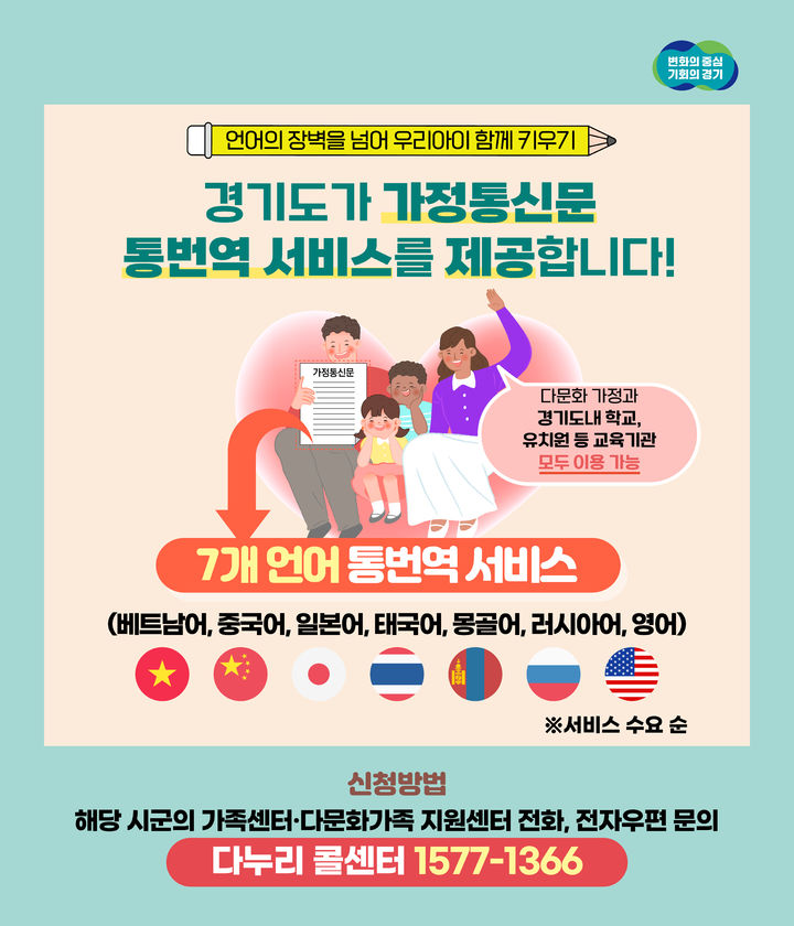 20일 도에 따르면 통번역 서비스는 다문화가족 학부모나 아동뿐만 아니라 배포할 가정통신문 등의 번역이 필요한 도내 교육 관련 기관도 이용할 수 있다. 해당 도내 30개 시군(과천 제외) 가족센터·다문화가족지원센터와 연계해 베트남어, 중국어, 일본어, 태국어, 몽골어, 러시아어, 영어 등 7개 언어로 통번역 서비스를 제공한다.