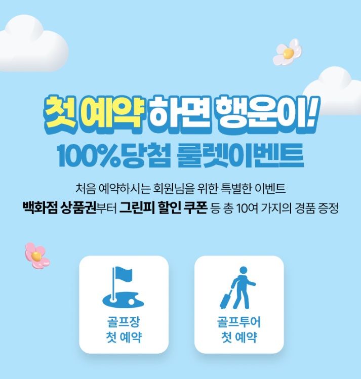 회원가입 후 부킹과 패키지를 예약하는 회원에겐 각각 최초 1회씩 룰렛 게임 응모권이 부여된다. 룰렛 게임에 걸린 경품은 신세계 상품권, 스타벅스 상품권, 피자, 치킨, 버거 기프티콘, 네이버페이 포인트, 그린피 할인쿠폰(2~5만원) 등 다양하다.