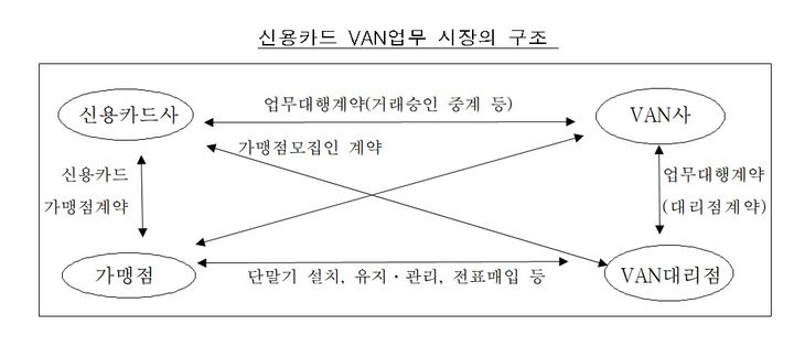 신용카드 VAN 업무란 신용카드사와 카드가맹점 사이 통신망을 구축해 신용카드 결제와 정산과정에서 신용카드 조회와 거래승인 등 업무를 대행하는 서비스다.