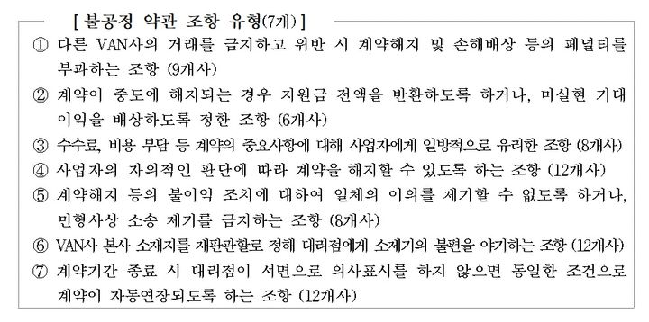 이 밖에 불명확하고 모호한 사유로 VAN사가 계약을 해지할 수 있도록 규정한 조항 등도 발견됐다. 민형사상 소송을 제기하지 못하는 등 항변권을 배제한 조항도 있었다. VAN사의 본사 소재지를 관할 법원으로 정해 대리점이 소를 제기하기 불편하게 만든 조항이나 자동으로 계약 연장을 할 수 있도록 하는 조항 등 다수의 불공정 약관이 지적됐다.