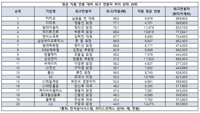 대기업 최고 연봉자-직원 평균 연봉 24배차