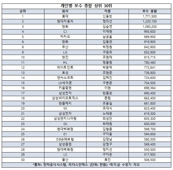 퇴직금을 제외한 개인 최고 보수액은 신동빈 롯데그룹 회장으로 5곳으로부터 177억1500만원을 받아 1위를 차지했다.