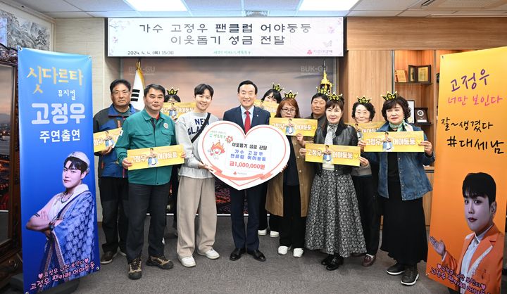 [울산=뉴시스] 박수지 기자 = 울산 북구 출신의 가수 고정우 팬클럽 어야둥둥은 4일 북구청을 찾아 북구 지역 저소득세대를 위한 이웃돕기 성금 100만원을 전달했다.