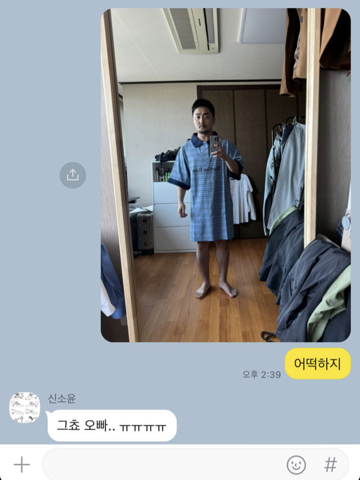 유병재는 17일 인스타그램에 스타일리스트와 메신저를 통해 나눈 대화 내용을 공개했다. 유병재는 사고 싶은 반팔 티셔츠가 있는 웹사이트 링크를 스타일리스트에게 보내며 "나 이거 M사이즈 사면 될까"라고 물었고, 스타일리스트는 "이거 길이가 좀 길어서, 스몰 해도 될 것 같다. 길이가 좀 길게 나온 제품이라서 잘라도 괜찮을 것 같다"고 했다. 구매 후 물건을 받은 유병재는 스타일리스트에게 착용 사진을 보낸 뒤 "어떡하지"라고 했고, 스타일리스트는 "그쵸 오빠"라며 말을 잇지 못했다. 유병재가 구매한 스몰사이즈 반팔 티셔츠는 너무 길어서 무릎까지 내려왔고, 마치 원피스를 입은 것처럼 보였다.