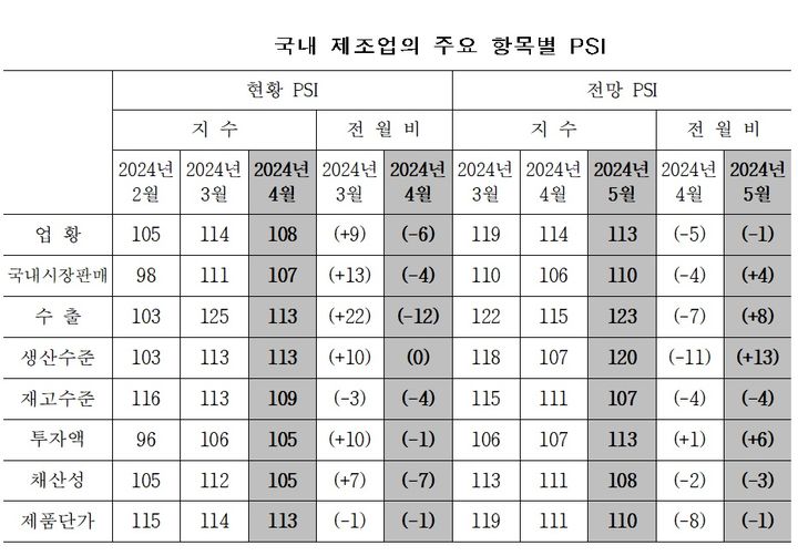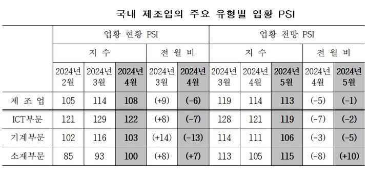 업황별 PSI는 정보통신기술(ICT)과 기계 부문에서 기준치(100)를, 기계 부문(103)도 3개월 연속 기준치를 웃돌았다. 소재부문은 2023년 4월부터 100을 밑돌다 이달 기준치를 회복했다.