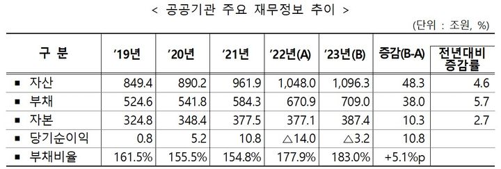 이중 부채는 전년대비 38조원 늘어난 709조원으로 집계됐다. 당기순손실은 3조2000억원을 기록했다. 부채비율은 177.9%에서 5.1%포인트(p) 증가하며 183.0%로 나타났다.