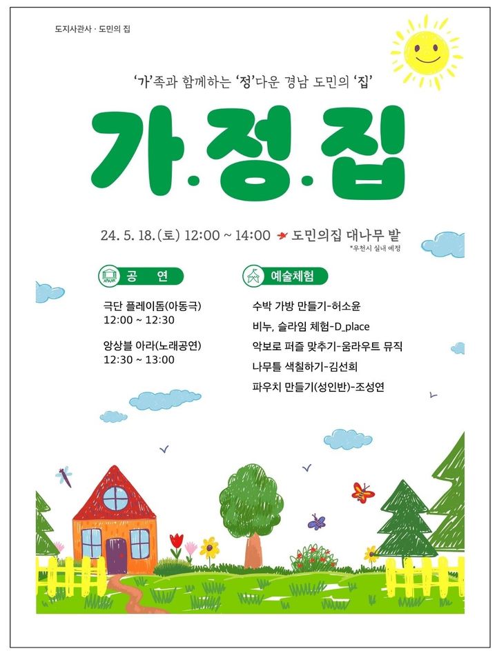 [창원=뉴시스] 홍정명 기자 = 경남문화예술진흥원은 18일 도민의 집에서 낮 12시부터 오후 2시까지 가정의 달 기획 프로그램 '가·정·집' 행사를 진행한다.