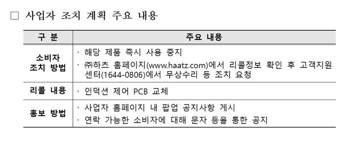 국표원 관계자는 "하츠 전기레인지 사용자는 제품 하단에 모델명과 제조연월을 확인한 뒤 리콜 대상인 경우 즉시 사용을 멈추고, 신속히 안전조치를 받아야 한다"며 "전기레인지가 싱크대에 매립 설치된 경우 제품 정보 확인이 어려울 수 있으니 제품이 유사하다면 고객지원센터에서 확인할 것"이라고 조언했다.