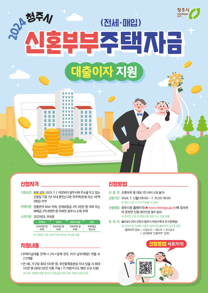 희망자는 7월1일부터 31일까지 청주시청 홈페이지에서 신청서를 내려 받아 작성한 뒤 청주시 여성가족과(청주시 청원구 상당로 314)로 방문 제출하거나 시 홈페이지(시민참여-신청접수-신혼부부주택자금 대출이자 지원신청)로 신청하면 된다.