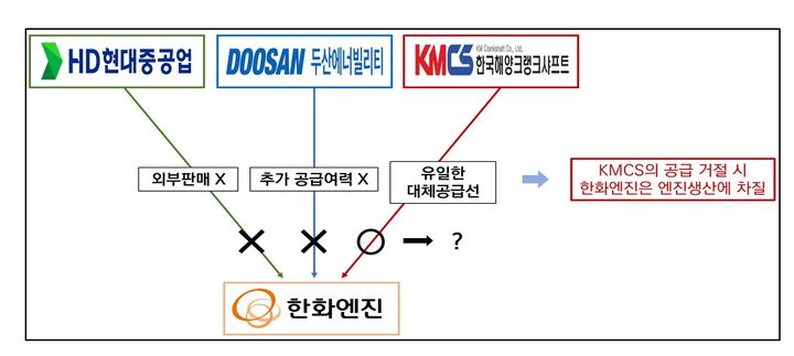 하지만 이번 기업결합으로 STX중공업이 HD현대중공업 계열사로 편입되면서 한화엔진의 엔진 생산에 차질이 발생하면, 그 수요는 100% 경쟁자인 결합회사로 전환된다. 이에 KMCS가 한화엔진에 CS공급을 거절할 가능성이 높아질 것으로 예상된다.