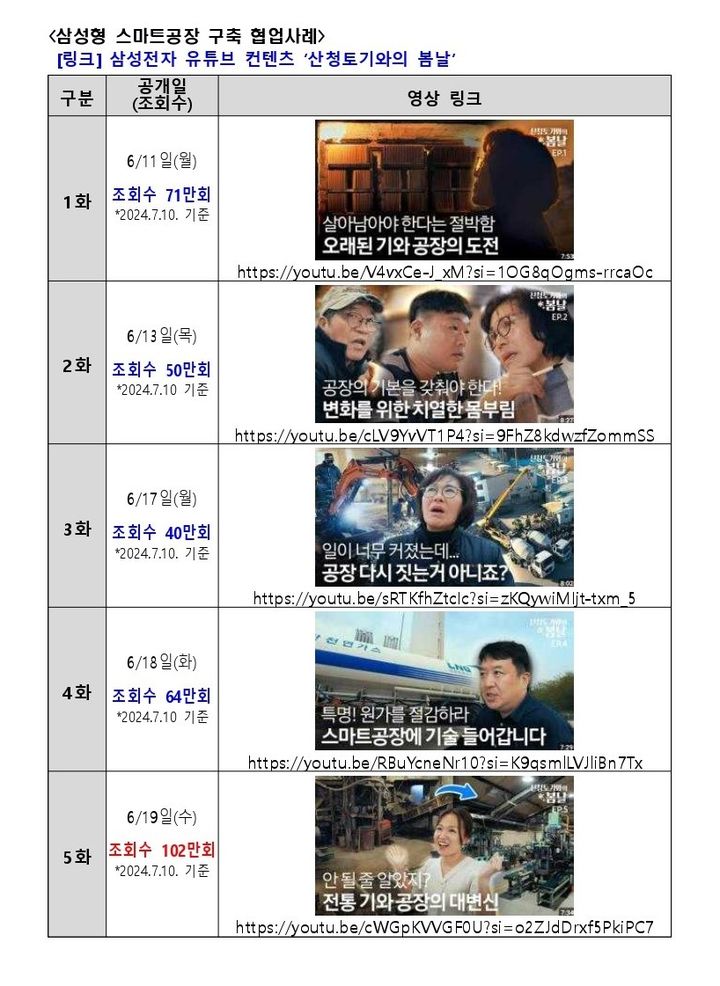 삼성 협업 스마트공장 구축지원(기초단계)을 통해 산청군에 있는 ‘산청 토기와’(기와 제조기업)는 삼성 스마트공장 전문가가 21주간 파견 근무하며, 생산관리시스템 등의 도입과 품질, 생산성, 물류 등 분야별 현장 공정혁신을 지원해 원가 9.3% 개선, 생산성 142% 개선, 물류 110% 개선 등 성과를 낸 바 있다.