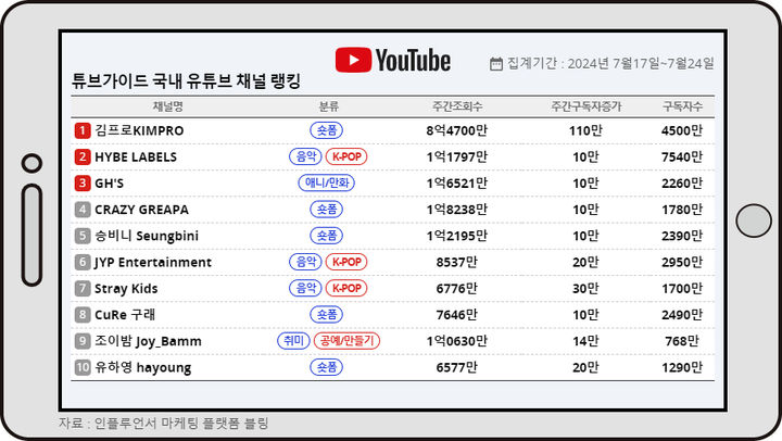 튜브가이드 7월 넷째주 국내 유튜브 채널 랭킹