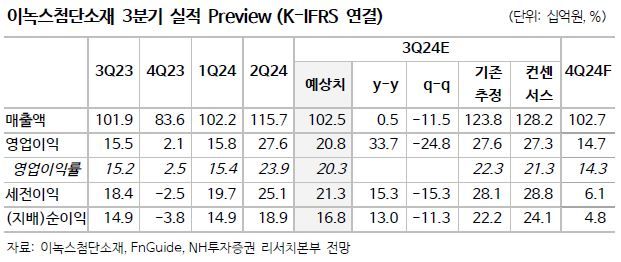 이규하 NH투자증권 연구원은 "이녹스첨단소재는 최근 고부가 제품 판매 확대로 양호한 이익률을 기록하고 있으나 국내 고객사 스마트폰 판매 부진 영향을 피하기는 어려울 것으로 예상한다"면서 "또 수익성 위주로 사업구조를 재편하며 물량이 소폭 감소하는 영향도 존재, 이를 고려해 올해와 내년 영업이익 전망치를 각각 기존 추정 대비 8.6%, 6.1% 하향한다"고 말했다.