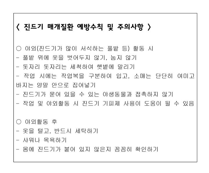 귀가 후에는 몸을 깨끗이 씻으면서 진드기가 붙어있는지 확인하고 입었던 옷은 털어서 바로 세탁하는 등 예방수칙을 준수하는 것이 중요하다.