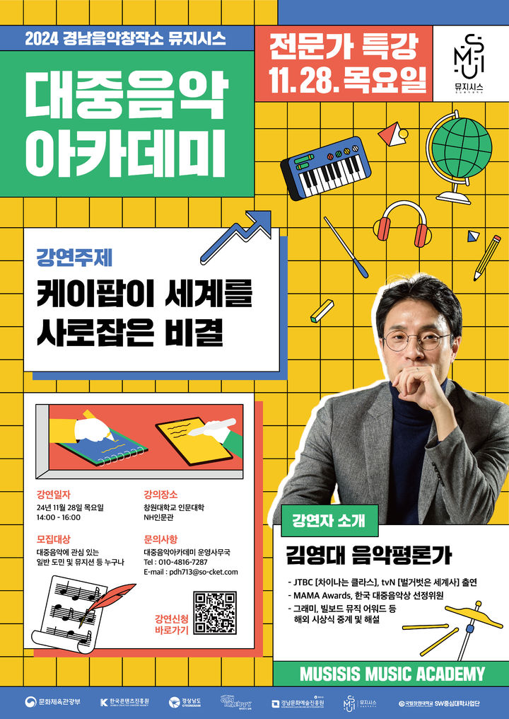[창원=뉴시스]홍정명 기자 = 경남문화예술진흥원이 운영하는 경남음악창작소 뮤지시스는 28일 오후 2시 국립창원대학교 NH인문홀에서 김영대 음악평론가를 초청해 '케이팝(K-POP)이 세계를 사로잡은 비결'을 주제로 대중음악 특강을 연다고 12일 밝혔다.