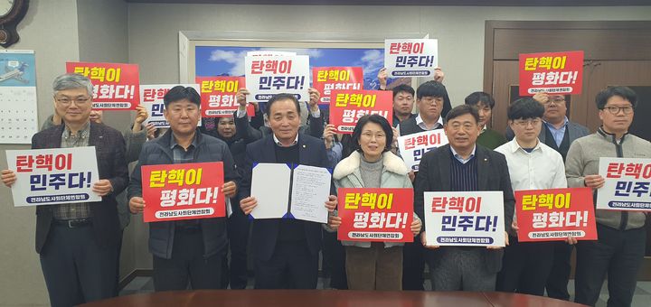 [무안=뉴시스] 송창헌 기자 = 전남도 사회단체연합회가 12·3 비상계엄 동조세력의 광주 집회에 심각한 우려를 표하며 극우세력의 금남로 집회 반대 성명문을 발표했다.