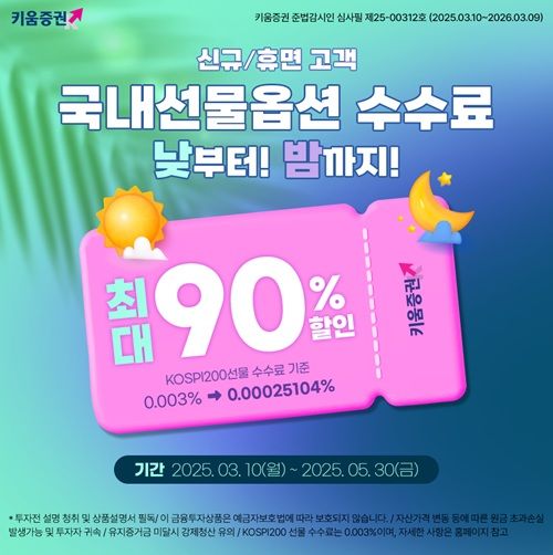 [서울=뉴시스] 배요한 기자 = 키움증권은 '국내선물옵션 수수료 최대 90% 할인 이벤트'를 오는 10일부터 5월30일까지 진행한다고 6일 밝혔다.