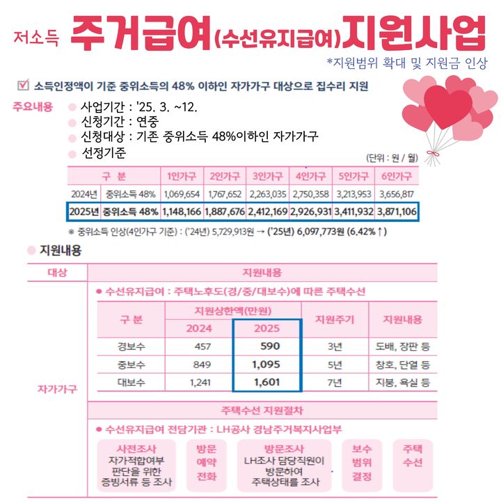 주택구조 노후도에 따라 경·중·대 보수로 구분해 지원하며, 보수 범위별로는 경보수 590만원(도배, 장판 교체 등), 중보수 1095만원(창호, 단열, 난방공사 등), 대보수 1601만원(욕실, 지붕 개량 등)에 상당한 수선을 해준다.