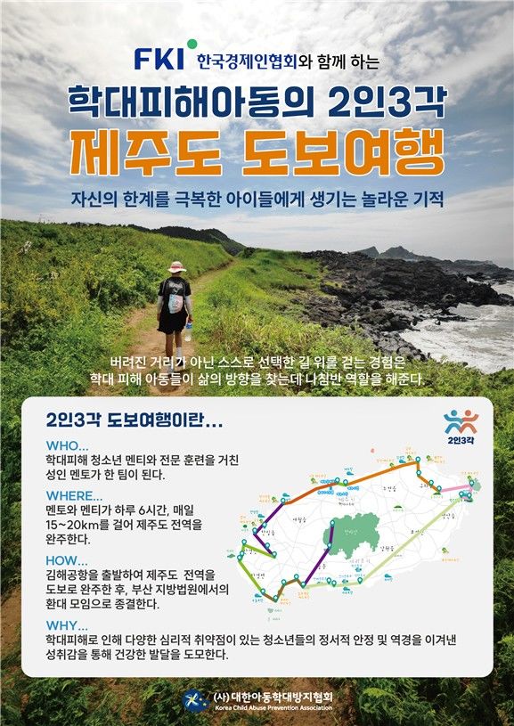 [서울=뉴시스]이현주 기자 = 한국경제인협회(한경협)가 제주 도보 여행을 통해 학대 피해 아동의 치유와 회복 지원에 나선다.