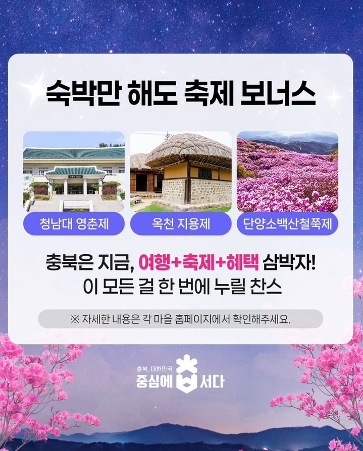도내에서는 내달까지 청남대 영춘제, 옥천 지용제, 단양 소백산 철쭉제 등 다양한 축제와 행사가 이어진다.