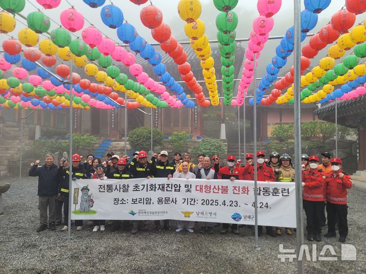[남해=뉴시스] 차용현 기자 = 국립공원공단 한려해상국립공원사무소가 지난 23일과 24일 양일간 경남 남해군 금산 복곡주차장과 호구산 용문사주차장에서 유관기관 합동 소방 및 긴급구조대응 훈련을 실시했다고 밝혔다.