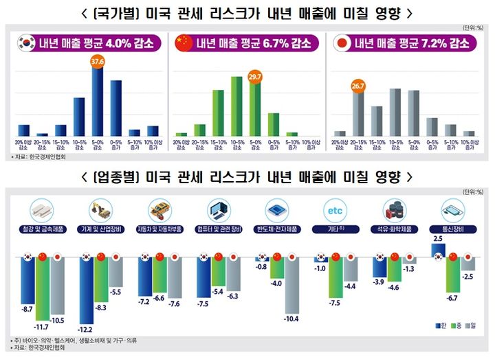 한국은 ▲기계 및 산업장비가 -12.2%, 중국은 ▲철강 및 금속제품이 -11.7%, 일본은 ▲반도체·전자제품 -10.4%로 각각 미국 관세 정책의 영향이 가장 클 것으로 나타났다.