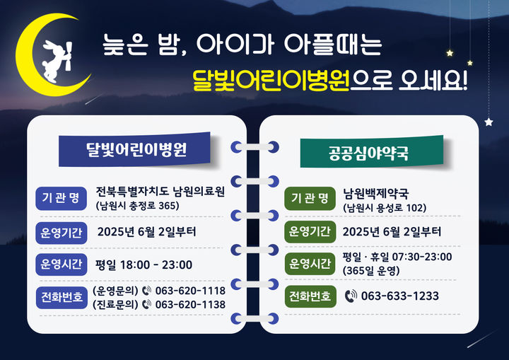 '달빛어린이병원'은 보건복지부와 지방자치단체가 협력해 운영하는 공공의료사업으로 야간 및 휴일에 소아환자의 진료공백을 해소하고 응급실 과밀화를 줄이기 위한 필수의료체계로 전국적으로 확대 운영 중이다.
