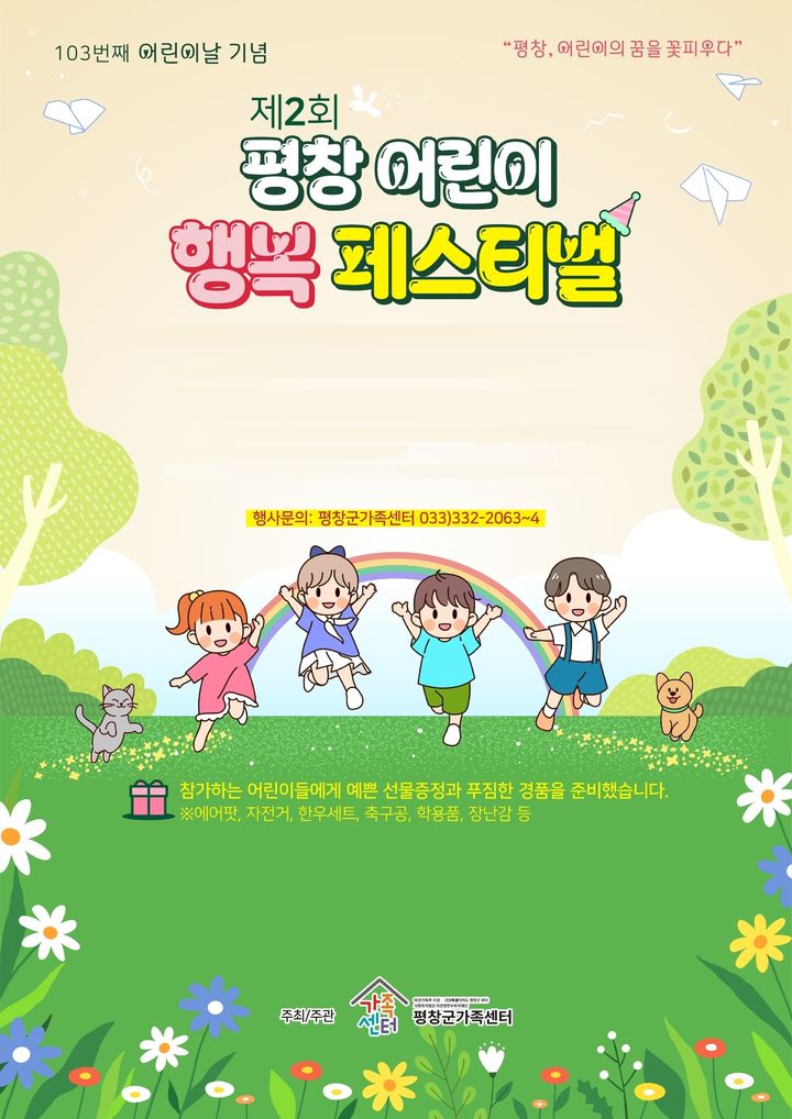 [평창=뉴시스]이덕화 기자 = 강원 평창군은 103번째 어린이날 기념해 3일 서울대학교 평창캠퍼스 중앙광장에서 '제2회 어린이 행복 페스티벌'을 연다고 1일 밝혔다.