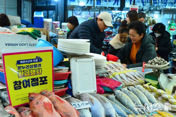 국내산 수산물이나 국내산 원물이 70% 이상 포함된 수산물 가공식품을 당일 3만4000원 이상~6만7000원 미만으로 구매하면 온누리상품권 1만권을 환급해준다. 6만7000원 이상을 구매하면 온누리상품권 2만원을 준다.