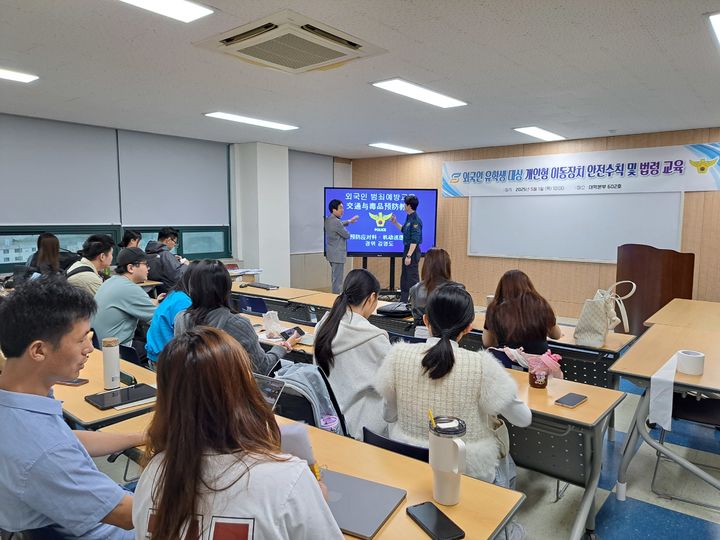 주요 교육 내용은 보행자 개인형 이동장치(PM) 교통안전 수칙, 마약류 경각심 고취 및 대처, 체류자격 외 활동 시 법적 문제점 안내 등 유학생 일상과 관련된 주제로 구성했다.
