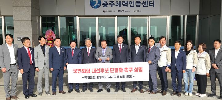 [충주=뉴시스] 이병찬 기자 = 충북 기초의회 국민의힘 소속 의장들이 김문수·한덕수 후보에게 대선 후보 단일화를 요구했다.