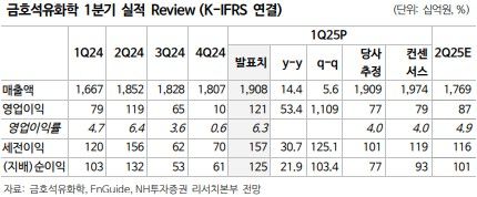 [서울=뉴시스] 배요한 기자 = NH투자증권은 12일 금호석유화학에 대해 1분기 실적이 컨센서스(증권사 평균 전망치)를 크게 상회했다며 투자의견 '매수', 목표주가 16만원을 유지했다.