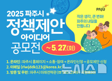 [파주=뉴시스] 송주현 기자 = 경기 파주시는 오는 27일까지 '2025년 파주시 정책 제안 아이디어 공모전'을 개최한다고 14일 밝혔다.