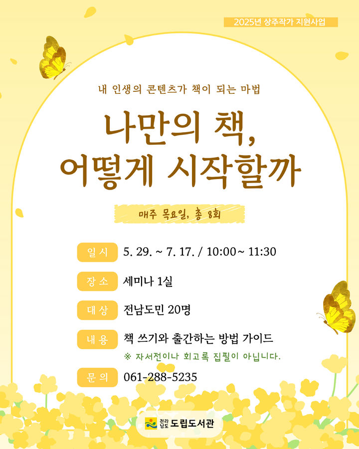 [무안=뉴시스] 송창헌 기자 = 전남도립도서관이 문화체육관광부가 주최하고 한국문화예술위원회가 주관한 '2025 문학상주작가 지원사업'에 선정돼 오는 27일부터 '나에게 건네는 다정한 말, 낭독과 필사'를 시작으로 프로그램을 운영한다고 19일 밝혔다.