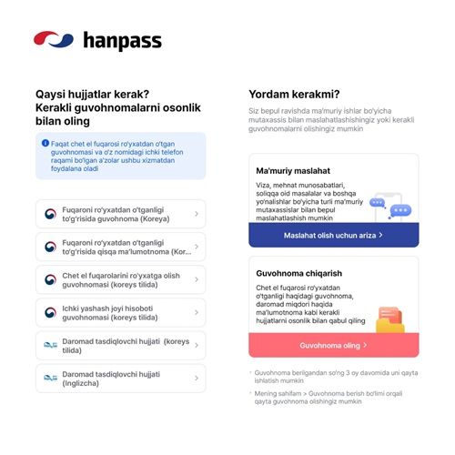 새롭게 선보인 증명서 발급 서비스를 통해 외국인등록사실증명서, 소득금액증명서 등 국내 체류 외국인들이 자주 사용하는 주요 공공 문서를 한패스 앱에서 비대면으로 발급받을 수 있다.