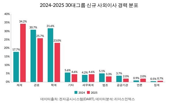 검사 영입 열풍이 사그라진 반면, 재계 출신은 전년 38명(17.7%)에서 올해 52명(34.2%)으로 급증했다.