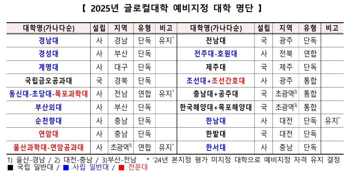 교육부와 글로컬대학위원회는 27일 올해 글로컬대학 예비지정 평가 결과 총 18개(25개교) 대학을 2025 글로컬대학 예비지정 대학으로 선정·발표했다.