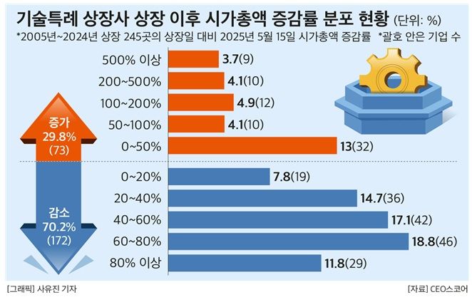 28일 CEO스코어가 2005년부터 지난해까지 기술특례로 상장한 기업은 245개사(상장 폐지 3곳 제외)를 대상으로 분석한 결과, 기업 가치 제고에 성공한 기업은 73곳(29.8%)에 불과하다.